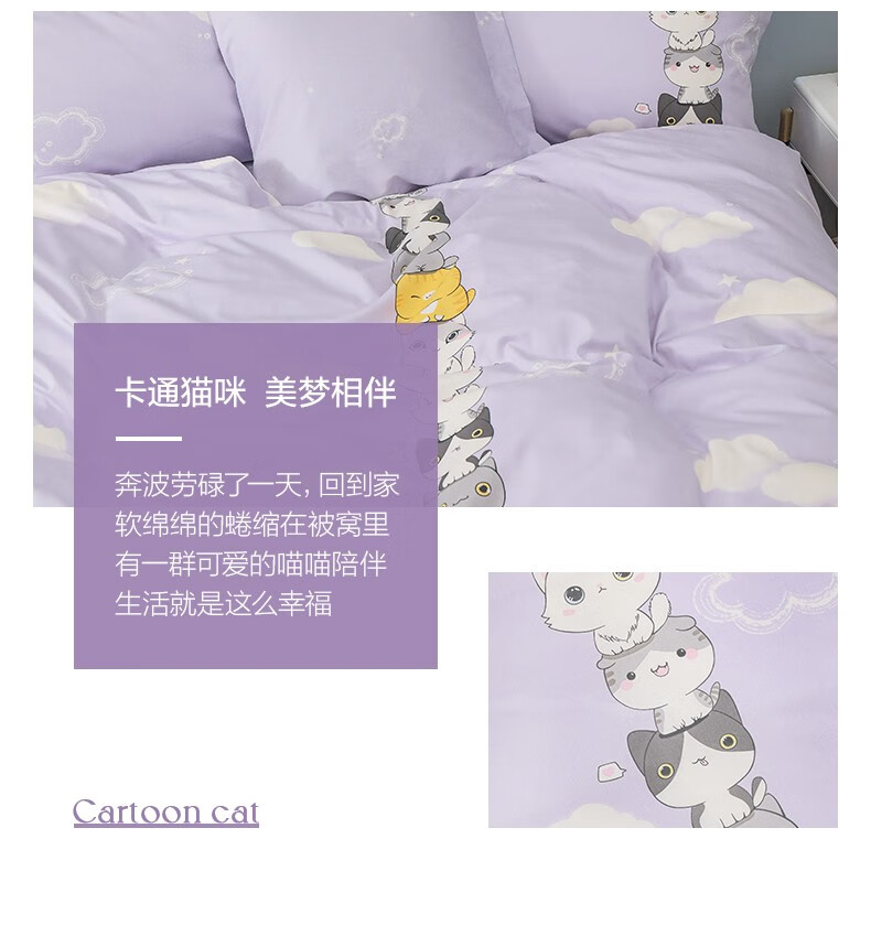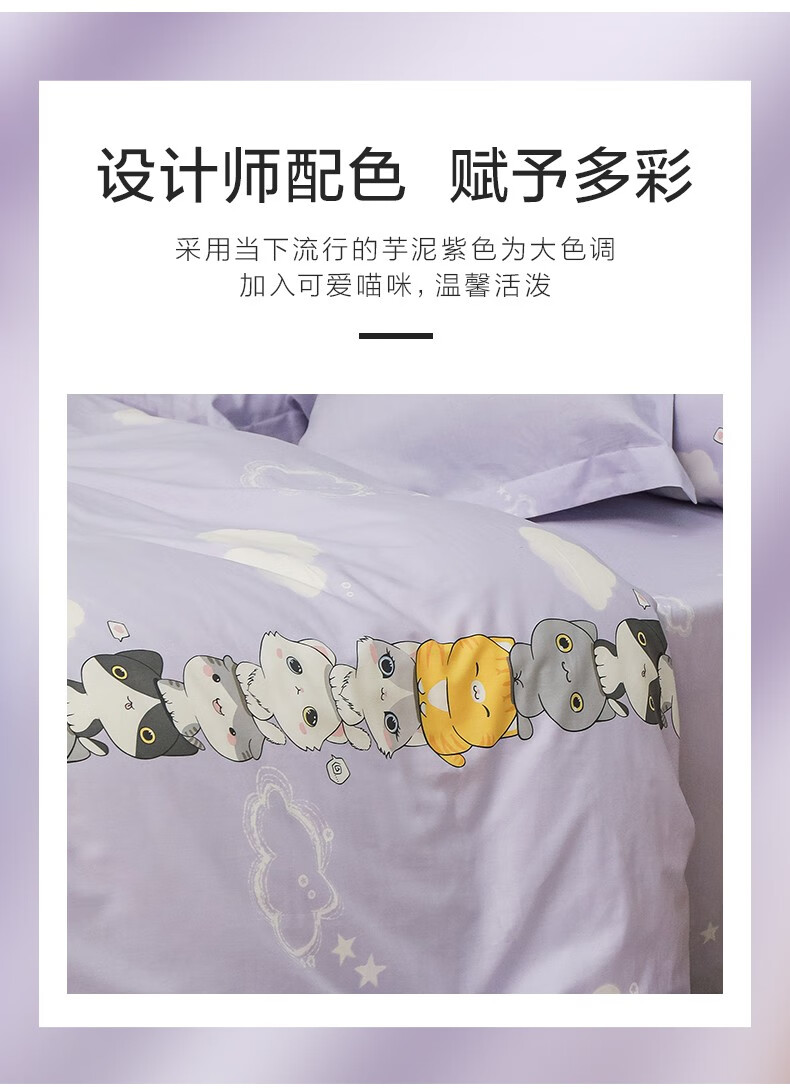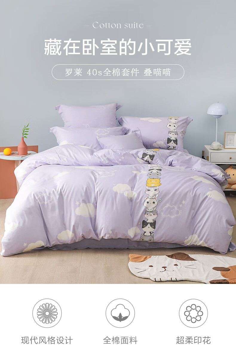 商品名称:罗莱(LUOLAI) 家纺纯棉四件套件全棉床单被套被罩床上用品 叠喵喵-紫色 1.5米床(被套200x230cm)