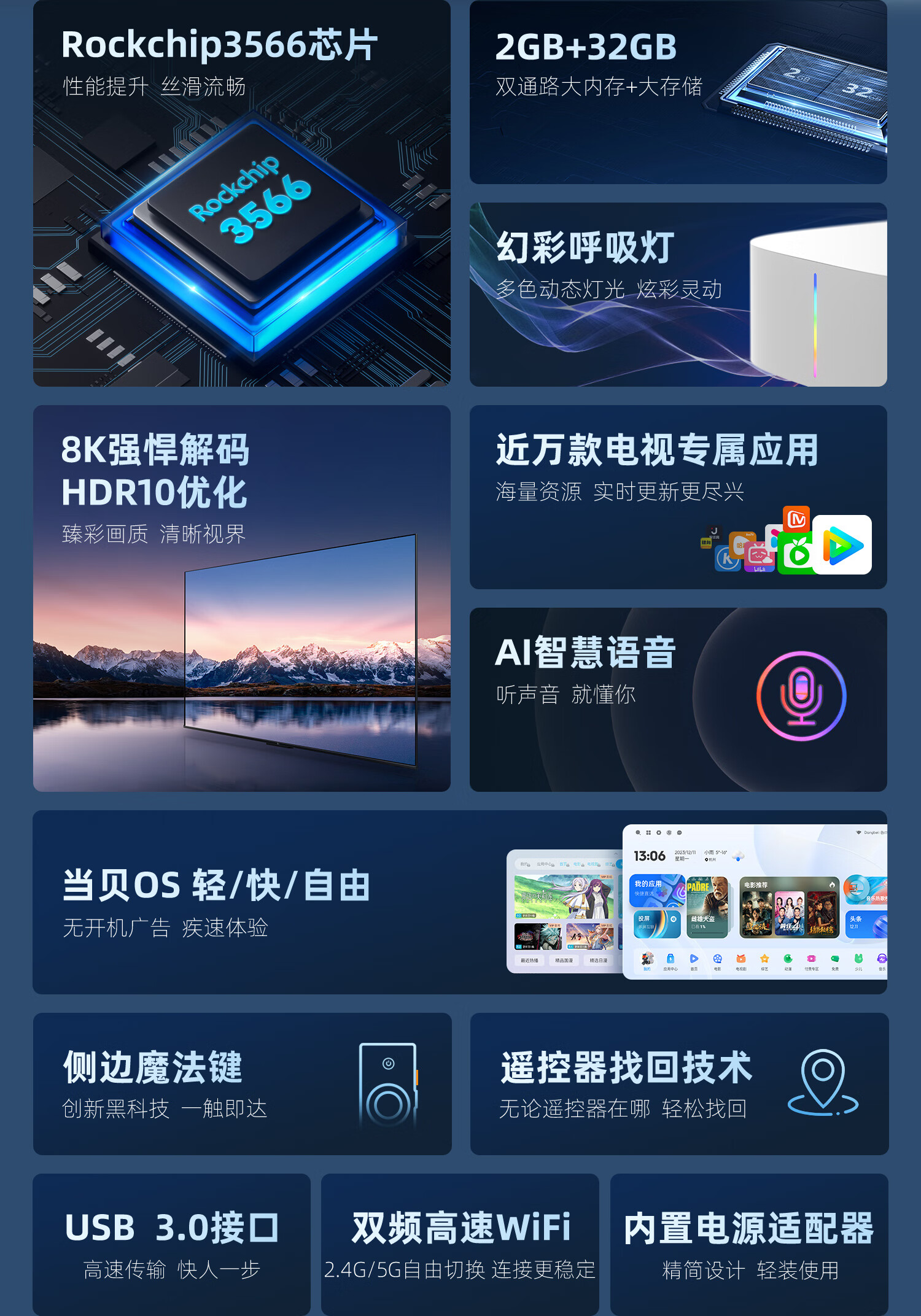 商品名称:当贝电视盒子H3 智能网络电视机顶盒 2G+32G内存 8K强悍解码 HDR10优化 5G双频WiFi AI智慧语音